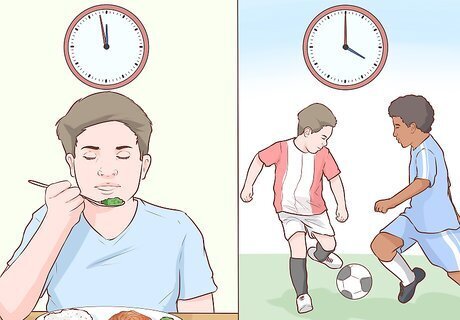 Choose the right time to eat. Avoid feeding your kids immediately before their game. If their stomach is busy digesting food while you’re they are to play a sport, they could experience stomach cramping or aches. Plus, their body will not be able to contribute the maximum amount of possible energy to their sport, because some will be used for digestion. If your child eats three or more hours before their game, they should eat a small meal with carbs and a moderate level of protein. For instance, if they are eating at 12:00 and their game is at 4:00, it would be acceptable for them to have a meal. If your child eats between one and three hours before their game, they should eat only a small snack that has more carbs than protein. For instance, if their game is at 4:00, they could snack sometime between 1:00 and 3:00. Have your child eat at different times before their games. Monitor their reactions to see what makes them feel best. Ask your child, for instance, "Do you think you played better when you ate a meal or do you think you played better when you had only a smaller snack closer to game time?"