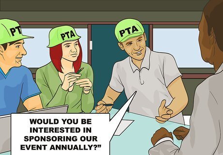Recruit local businesses as sponsors. Local businesses are a great, often untapped, source of fundraising dollars in your local community. Businesses may see sponsoring an event as an opportunity to bolster their own business. Identify several businesses that might stand to profit from an association with the PTA. Think about restaurants, sporting goods stores, book stores, or other business that cater to families and children. Visit the business and make your pitch. Say something like “Mr. Parker, I was hoping you – and your sporting goods store – would be interested in sponsoring the PTA’s marathon next month. All you’d have to do is help us with a few supplies and you could post advertisements around the event. I think you’d get a lot of goodwill from the community.” Try to maintain a long-term arrangement. After an initial sponsorship deal, let the business or business owner know that you’d like to maintain the arrangement in the future. For example, say “Mr. Brownson, I think your sponsorship was an extreme success. Would you be interested in sponsoring our event annually?”