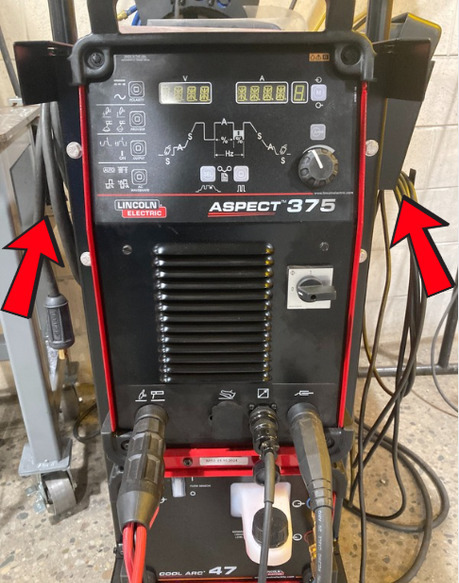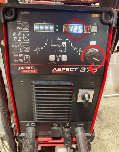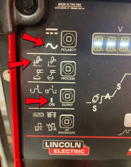 Adjust the weld process settings. Turn the welder on, then locate the buttons on the left-hand side of the welder. When selected, a light will be illuminated on that certain process. Using the attached photo, ensure the three lights match.