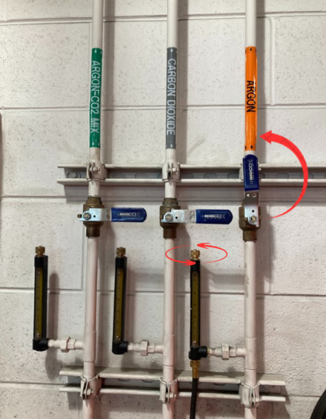 Turn on and adjust the shielding gas system. Acquire 100% Argon shielding gas and regulator. Rotate the valve so it is parallel with the pipe to allow gas to flow. Set the regulator to 25 CFH (Cubic feet per hour) by pressing the foot pedal and rotating the dial clockwise to increase CFH and counterclockwise to decrease CFH. Too little CFH will cause erratic weld arcs as well as weld profile discontinuities. Too much CFH will cause contamination and porosity due to high CFH turbulence.