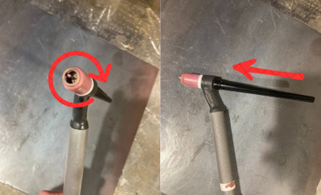 Assemble the torch. Screw the gas lens onto the front of the torch. Then take the tungsten and slide the collet on with the larger end of the collet towards the back. Then take the tungsten and collet and slide it through the back of the torch through the gas lens. Screw the back cap onto the rear of the torch and the shielding cup onto the front.