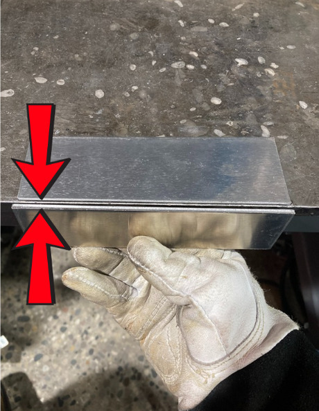 Set up the 1G corner joint. Create a 90-degree angle with aluminum coupons. Set the first coupon flat on the table. Then push that same coupon so it protrudes roughly 1/4" off the tabletop. After that, place the second coupon in one's left hand. Use the edge of the table to assist the process and push plates together/apart to create a 1/16” root opening. A root opening is the intentional gap that is placed between the coupons to ensure melt-through penetration is established.