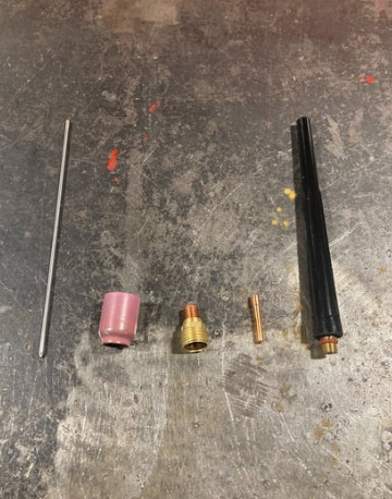 Locate the consumables for the torch. When acquiring all consumables, ensure they are meant for the same diameter tungsten. For tungsten selection, use a 3/32” ceriated or lanthanated tungsten, which is optimal for both aluminum and stainless steels. If consumables are not the same diameter, the fitment in the torch will be too loose and will not conduct an electric current. The necessary consumables that are in the photo from right to left include: tungsten electrode, shielding cup, gas lens, collet body, and back cap.