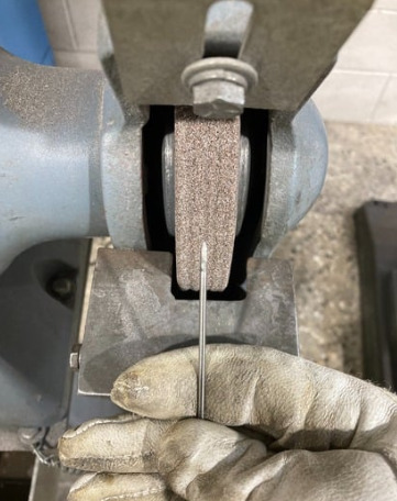 Prepare tungsten for welding aluminum. Acquire a 300-grit tungsten bench grinder. Rotate the tungsten when sharpening and make a 45-degree angle on the tungsten tip. Dip the tungsten in water after two full rotations to prevent the tungsten from becoming hot. Repeat the process until the tungsten is sharp to a point. *See tip #3*