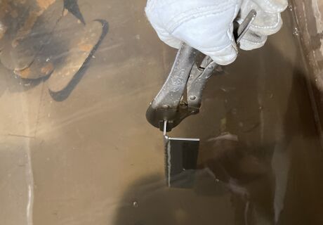 Quench the corner joint. Acquire a pair of channel lock pliers. Adjust the screw on the end of the channel locks for the 1/8” thick coupons and clamp-weld specimen. Quench the workpiece in water to cool it down to room temperature. Ensure the welded specimen is cool to the touch.