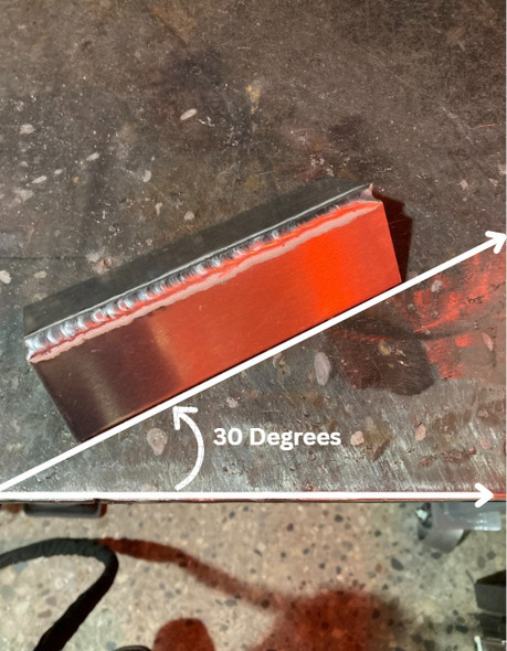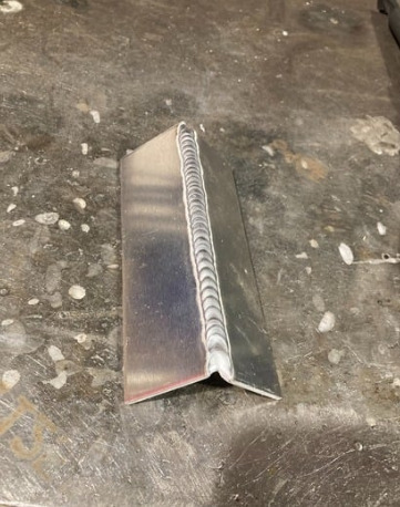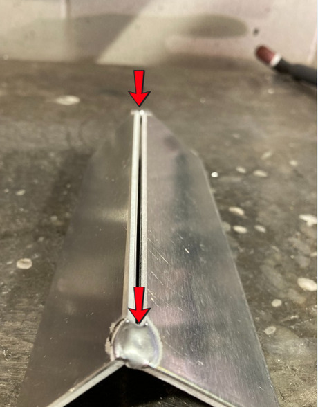 Tack the corner joint together. Acquire and hold the torch in the joint and press the foot pedal to the floor. Watch the material heat up and join the two pieces with a molten puddle. To end the arc, release the foot pedal. After tacking one side, bend the other side of the aluminum corner joint to match the root openings and tack. *See tip 4*
