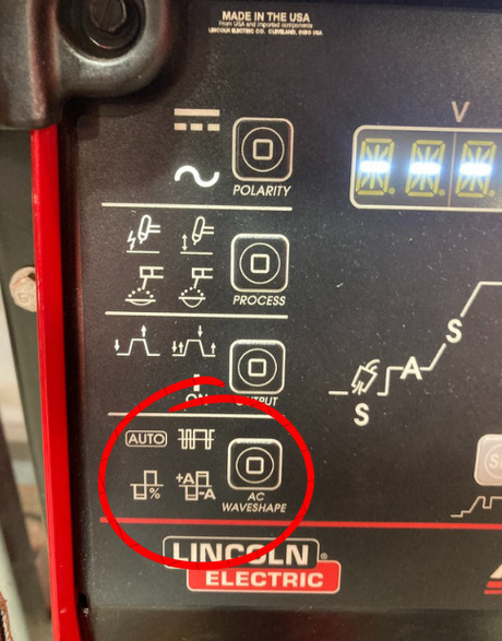 Adjust the background settings. Locate the bottom AC Waveshape button. Click it and use the main dial knob to set the following for AC aluminum Gas Tungsten Arc Welding. AC Waveshape Settings: Frequency - 150 Hz Balance - 80% Preflow - 2 seconds Postflow - autoAC frequency button.png