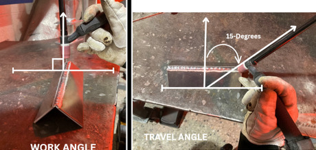 Establish work and travel angles. Before initiating the arc, adjust the torch grip so that a 90-degree work angle and a 15-degree travel angle are established. A work angle is the relation from the electrode to the base surface. Thus, if a protractor is laid flat on the table transverse to the weld joint, at 90 degrees is where the work angle should be. The same goes for travel angle, which is the angle at which the torch is traveling in relation to the joint. Thus, if a protractor is laid flat on the table running parallel with the joint, the electrode must be at 15 degrees from 90. *See tip 5*