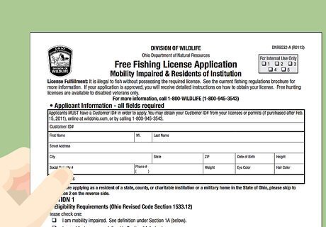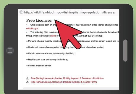 Print out your license application. While individuals born before January 1st, 1938 will obtain their free licenses exactly the same way a person would obtain a paid license ( by phone, mail, in person at any license outlet, or online at http://wildlife.ohiodnr.gov/), if you fall into one of the other categories, the procedure is a little different. If you are eligible for a free license for any reason other than age, you'll need to submit a formal application.The application is available at http://wildlife.ohiodnr.gov/fishing/fishing-regulations/licenses. Simply expand the section at the bottom that says "License Exemptions" and click the links at the bottom of the expanded section.