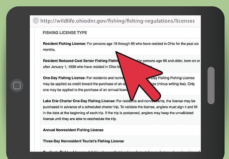 Determine what kind of Ohio fishing license you will need. Anyone who wants to fish in Ohio will most likely need a fishing license. There are several options available, depending on your residency and the length of time you plan to fish. Get a Resident Fishing License if you are between the ages of 16 to 65, and you have lived in Ohio for at least 6 months. It will cost you $19. If you are 66 years old or older, and you have lived in Ohio for at least 6 months, you can obtain a Senior Resident Fishing License for $10. Purchase a 1-Day Fishing License if you are planning a fishing outing for just 1 day. Residents and visitors pay $11 for this license, and it can be used towards an annual license if you decide to fish again. Anyone planning a charter fishing trip on Lake Erie for 1 day can also get an $11 license. Get an Annual Nonresident License if you are not a resident of Ohio, but you plan to fish in the state for several days throughout the year. This will cost $40. Buy a 3-Day Nonresident License if you plan to do your fishing in Ohio just during one trip, but you know it will be for more than 1 day. This license is $19.