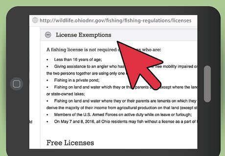 Decide whether you qualify for a free license. There are several categories of people who are eligible for a free license--but they still do need to get a license. These categories of people include: Disabled veterans, former prisoners of war, residents of state or county institutions, or disabled individuals who need assistance casting and retrieving their lines. People born before January 1st, 1938.