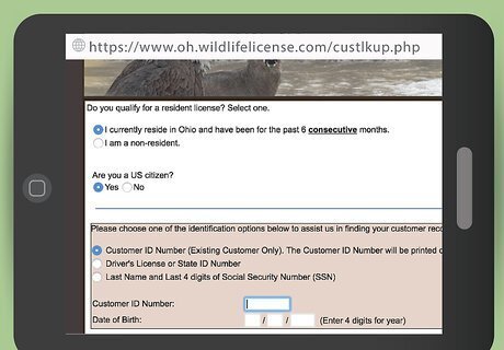 Purchase your Ohio fishing license online. Any license can be purchased on Ohio's Division of Wildlife secure website. You will need a credit or debit card to pay for the license, and the ability to print your license once you have paid for it. You will need the Customer ID Number from an existing license, a driver's license number, and/or your Social Security number. You can find the website at https://oh-web.s3licensing.com/Home/Info. The license can be printed or merely shown on the screen of a mobile device, whichever is more convenient for you.