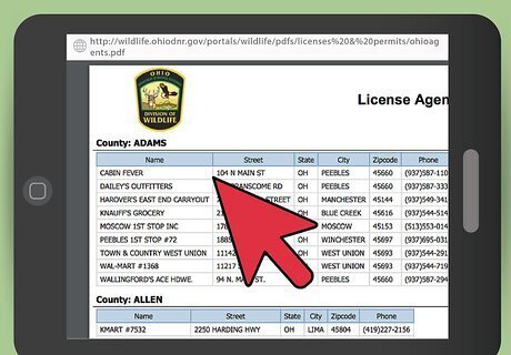Get your license from a participating agent. Each county in Ohio has stores and vendors that sell fishing licenses. If you are unsure of where to look, check the listing on the Department of Natural Resources website, or call 1-800-945-3543, to get a list of vendors in your area. You can pay by cash, check, or credit card. You will need to provide a Customer ID Number from an existing license, a driver's license number, and/or your Social Security number. The retailer will print out a copy of your license.