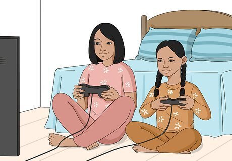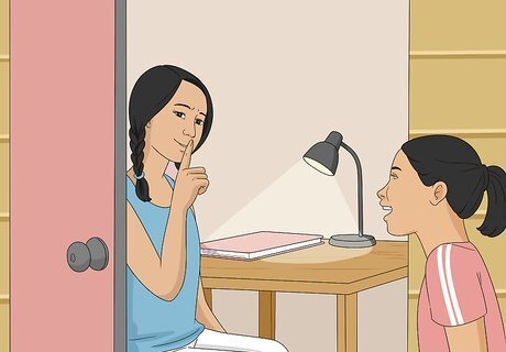 Do something quiet together. A great way to hang out with your sister is to do quiet activities together. First, invite your little sister into your room to hang out or go into her room. Next, tell her that you want to do quiet things while you hang out. This can include: Reading books Playing video games Drawing Playing on your phone
