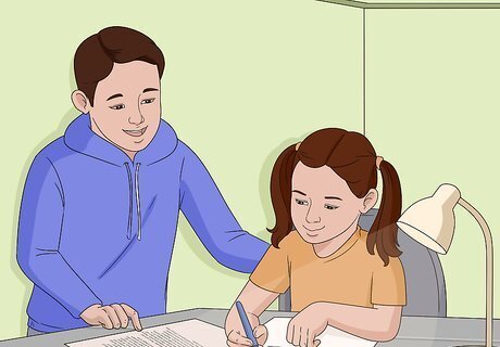 Help her with her homework. Since you’re older, you have a better understanding of schoolwork than your little sister. If she’s struggling with a math problem or has trouble spelling, offer to help her. Carefully explain the assignment and help her answer each question on her own. There’s a difference between helping someone and doing their homework for them. If you give her all the answers, she won’t learn anything.
