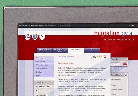 Total your points to qualify as a skilled worker. If you're not immigrating to Austria because you have family there, or because you are seeking asylum as a refugee, you generally need to qualify as a "very highly skilled worker." You can earn points based on criteria such as your average income, highest level of education, work experience, and language skills. Higher points are awarded if you work in mathematics, informatics, natural sciences, or technology. You also earn additional points if you've participated in research or have patents in your name. Austria has a points calculator available at https://www.migration.gv.at/en/service-and-links/points-calculator/ that you can use to find the total number of points you're eligible to receive.Tip: If you are a citizen of an EU country or Switzerland, you may be able to get an EU Blue Card to live and work in Austria. There is no points system for the EU Blue Card. You must have a binding job offer in Austria.