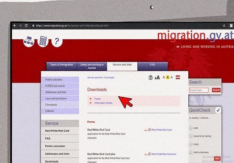 Fill out your application. Once you have employment in Austria, you can apply for a Red-White-Red card, which gives you the right to reside permanently in Austria, subject to certain conditions. The application for a Red-White-Red card is in German and must be completed in German. You can download a copy of the application at https://www.migration.gv.at/en/service-and-links/downloads.html, or you can visit the nearest Austrian embassy or consulate and pick one up. If you plan to pick up an application, call ahead of time and schedule an appointment. Make sure you download the application that is appropriate to your situation.