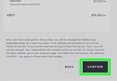 Review your order and click Continue. It's the green button at the bottom of the page. You'll see a screen that says, "You're all set." Your account won't be charged for HBO services for 14 days, after that, an additional $14.99 will be charged to your Hulu account each month. You can cancel HBO or Hulu at any time.
