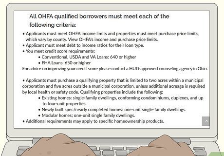 Determine your eligibility for Ohio Housing Finance Agency (OHFA) loans. OHFA loans have income and purchase price limits that vary by county. Each type of loan also has debt-to-income ratio requirements that you must meet. Conventional, USDA, and VA loans require a credit score of 640 or higher. For FHA loans, you need a credit score of at least 650. To find out what loans you might be eligible for, go to https://myohiohome.org/qualify/Default.aspx and answer the questions. Then click the "Am I eligible?" button.