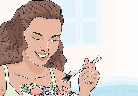 Try a gradual weight loss plan after your pregnancy. It’s completely normal to want to lose weight after your pregnancy. Keep in mind that you may lose a good portion of your baby weight within 6 weeks of giving birth. Instead of trying a dramatic diet, adjust your eating schedule so you’re eating 5-6 smaller meals each day. When you work out, start out with an easy physical activity, like a simple walk around your neighborhood. There’s no need to rush—your body goes through a lot of adjustments after giving birth. What matters most is that you maintain a healthy diet. Try to avoid junk food, like soda and sugary treats. These can get in the way of your weight loss goals.
