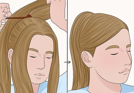 To do an Aussie slickback, separate out the front section of your hair. Part it cleanly down the middle, then either brush it forward or tie it in front of your face with an elastic to keep it out of the way. Pull the rest of your hair into a ponytail, leaving a little messy volume on the top of your hair. (Lift small sections with your fingers or the tail end of a comb for even more volume.) Secure the ponytail with an elastic. Comb the front section of your hair back to meet the rest of your ponytail. Either swoop it down and back or comb it sleekly to the sides, depending on what you prefer. Use a hair stick or gel and a comb, spoolie, or boar brush to slick down the front section. Then, tie it with an elastic.