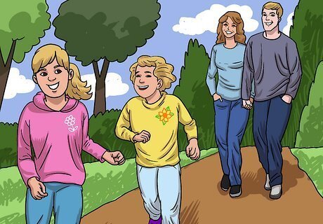 Suggest physical activities. You know how important regular exercise is for health and wellness. Counteract the couch potato syndrome by getting your kids up and moving. Take a Frisbee out into the yard. Lace up your trainers and walk to a nearby park. It may also be fun to run a kids’ “exercise boot camp” on the weekend. Getting your children involved in sports at school or in the community is also a great way for them to stay active. Being active also lessens the amount of time they have to spend watching TV. Start a fun family tradition of going on a picnic, hike, or other outdoor adventure every few weeks. During cold weather, encourage your kids to go out and sled, ice skate, or have a friendly snowball fight.