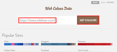 Paste your website URL into the box. Simply enter the URL of the website and click on the GET COLOURS button. (e.g: https://www.wikihow.com/)