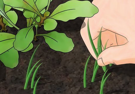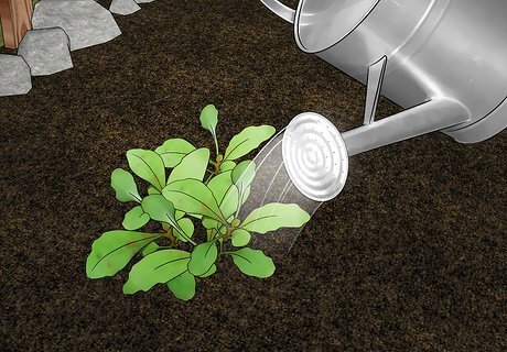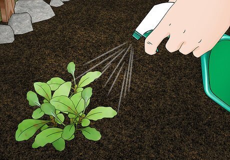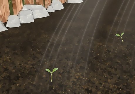 Water the soil to keep it moist. Water the soil frequently until the plants sprout leaves, always checking that the soil is just moist. Once the plants are mature, you won’t need to water quite as much. Allow the soil to dry out between waterings, and then water again to make the soil moist. How often you water will depend on the climate in your region. If you’re getting lots of rain, you probably won’t need to water at all. If you have weeks of full, hot sun, you may need to water daily, or at least a few times per week.