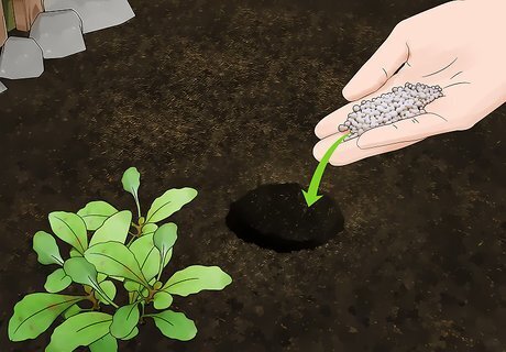 Add fertilizer to the soil once per month. Dig a small trench about 4 inches (10.16 cm) away from each plant. Add a small layer of fertilizer to the soil and then rake the trench closed. This will replenish nutrients in the soil. A general purpose fertilizer will work perfectly for these plants. You can pick this up online or at a local nursery.