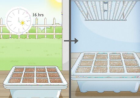 Expose the seeds to light for up to 16 hours a day. If you live in a climate that gets lots of warm sun, put the seed trays near a windowsill so that they can get sunlight. You can also use artificial light from lamps to heat up the seeds and help them grow, if necessary. If you’re going to use artificial lighting, hang growing lights 2–4 inches (5.1–10.2 cm) above the plants. If you notice the seedling starting to wilt, the lights may be too close.