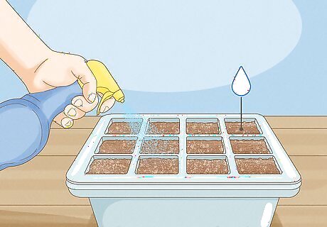Mist the soil with water when it becomes dry. While you don’t want to drench the seeds in water, they’ll need to be properly hydrated in order to grow. Use a spray bottle to dampen the soil after the seeds are planted, and check the soil each day to make sure it isn’t dry. Make sure the seed trays have proper air ventilation so that the soil doesn’t become soggy.