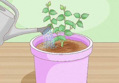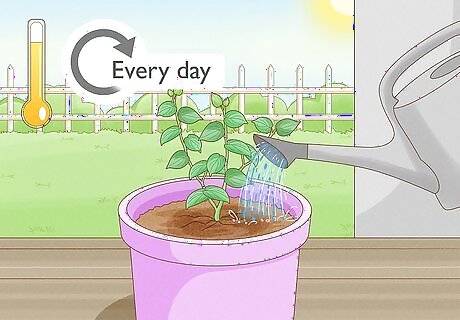Keep the soil moist, especially during warmer weather. It’s important to keep the soil damp without letting it get soggy. Water the plant whenever the soil feels dry—if it’s hot outside, the plant may need water every day. Make sure the pot has proper air ventilation holes so that water can drain easily if needed. To see if the plant is too dry, try tilting the pot to the side to see how much it weighs. If it feels super light, the plant is too dry and needs more water.