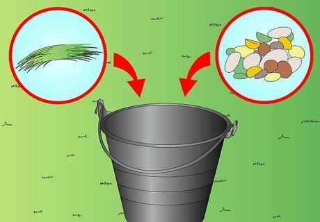 Pour some grass and/or legume seeds into a bucket. Grass and legume seeds would be of any species you've chosen to seed your pastures with, depending on your location. Put as much in as you can comfortably carry, depending on how far you have to carry it or how big of an area you want to seed at one time.