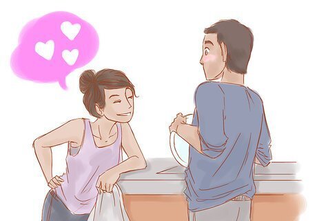 Show him that you appreciate him. After you have been with someone for a long time, you might start to take for granted that he knows how you feel about him. Maybe you’re not in that honeymoon phase anymore, but you want him to know how you feel about. Let him know that you care and appreciate everything he does. For example, you can thank him for paying for dinner, for taking out the trash, or for holding the door open for you. Say, "I really appreciate how you took the trash out last night" or "Thank you for the coffee you brought me. It made my morning." Tell him how good you think he looks, how you like the beard he’s grown out, or that you like his new cologne. Tell him, "That shirt looks so great on you" or "I love that new haircut. It makes you look handsome." Dress nice for him. Wear his favorite shirt, the underwear he likes you in, or the fragrance he likes the smell of.