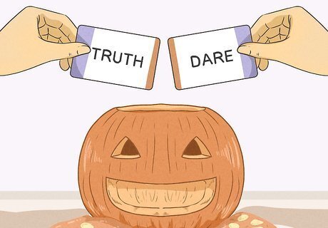Play truth or dare with extra spooky challenges. Before you start, ask your guests to write down dares on slips of thick paper. Stick them inside the guts of a pumpkin. Then, when you play, make a person reach into the guts to grab a dare if they don't choose to answer a question truthfully. Make the game even creepier by playing in the dark. For a dare example, you might write "Close your eyes and eat whatever food is put into your hands," or "Howl at the moon in a public place." For truth ideas, you could use "What's the worst nightmare you've ever had?" or "What would you take with you if you had to spend the night in a haunted house?"