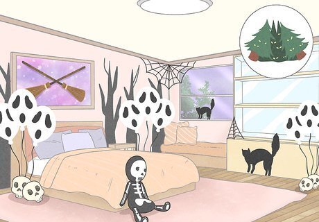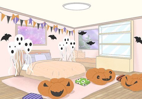 Use your theme as a guide to decorate your sleeping space and eating area. You don't have to decorate your entire home, but focus on the areas your guests will be spending time in and try to match your theme. If you're going for a mad scientist theme, serve treats in beakers and test tubes and set out a fog machine, for instance. Want a simpler theme? Pick a Halloween creature and display it around your space. For example, hang bats from the ceiling, stick cut-out bats on the walls, and stick them on mirrors. Other simple Halloween creatures include ghosts, witches, skulls, skeletons, spiders, and black cats.
