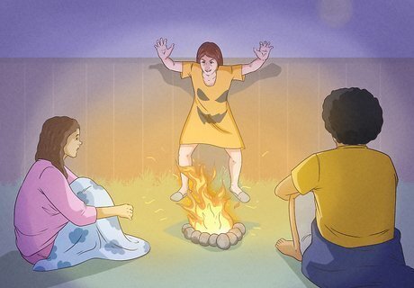 Sit around a bonfire and tell scary stories or urban legends. Gather around and ask everyone to tell their own frightening tale or a legend that they've heard. If anyone's having a hard time coming up with stories, have a few spooky books nearby or print stories off of scary story websites so they can read one to the group. Can't build a bonfire? That's totally fine! Have your guests get into their sleeping bags and turn off the lights. Give everyone a flashlight so you can see each other.