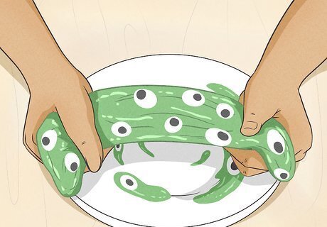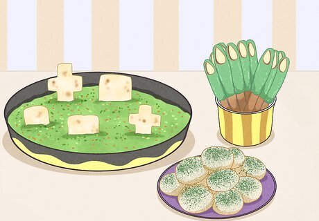 Set out savory snacks like chips and dip for people who don't want sweets. Put out lots of options like party dips with veggies, crackers, and cheese. Have fun with the way you display the food! Spread guacamole in a long, shallow dish and stick crackers in it to look like gravestones, for example. You could also roll a cheeseball in finely minced green herbs so they look moldy. Want to serve a scary dinner? Boil black pasta and toss it with an orange or red pasta sauce before you serve it. While the sauce won't be bright, it will make the pasta look slimy.
