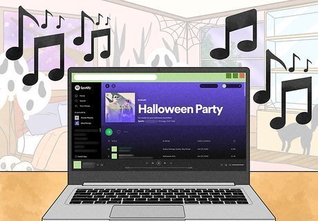Play music to set the mood. Going for a spooky sleepover? Pick a CD or streaming playlist that has ambient or background Halloween sounds. These might have slamming doors, eerie laughing, or bubbling sounds, for example. Do you want more of a party vibe? No problem! Pick fun Halloween songs like "Monster Mash," "The Dr. Who Theme," or "Ghostbusters." You can always switch up the music throughout the night. Start with fun party music and change it to scary background music when you do party games.
