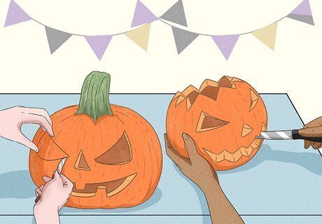 Decorate with black and orange for a classic Halloween look. Didn't pick a theme? It's totally fine to stick to iconic black and orange decorations. Blow up balloons and scatter them around your sleeping space or hang them in clusters from the ceiling. You can also drape streamers from the ceiling or let streamers hang down between entryways. Set out orange and black LED candles to give your space some spooky low lighting. Don't forget that pumpkins are decorations too! Set out jack-o-lanterns or display knotty, green, or white varieties of pumpkins to switch things up. You don't have to carve pumpkins if that's too cumbersome or takes too long. You can print out some designs and pin them on your pumpkins, or even use decoupage techniques to apply a design onto the pumpkin surface.
