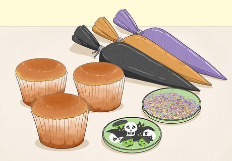 Set out a cupcake or cookie bar with decorating supplies. Give your friends a fun way to personalize their own treats— put out cupcakes or baked sugar cookies in lots of spooky shapes. Then, set out frosting, sprinkles, eyes, and food coloring gel so they can make monstrous-looking cupcakes or cookies. Guests can squeeze white frosting back and forth to make a mummy treat or drizzle a little red food gel on top to look like blood. For an extra-special treat, make caramel apples. You can even dye the caramel black to make the apples look poisoned.