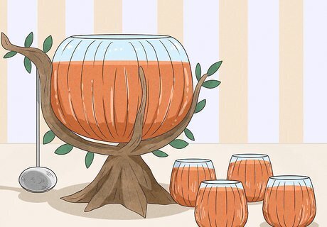 Fill a cauldron with punch so your guests can serve themselves. Punch is a super customizable drink to serve at your sleepover. For a bright orange Halloween punch, mix 1 US quart (0.95 L) of orange sherbet with a 12 fl oz (350 ml) can of orange juice concentrate, 1 litre (4.2 c) of club soda, and 1 litre (4.2 c) of ginger ale. You could also serve a deep red fruit punch if it matches your party colors better. For a creepy punch display, fill a clean latex glove with water and tie it shut. Freeze the glove until the water turns to ice and cut away the glove. Float the hand in your punch bowl and watch your guest's reactions!