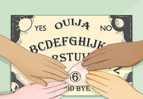 Set up a Ouija board and try to contact a spirit. For a truly freaky activity, get a Ouija board and gather your guests around it. Dim the lights and choose a person to be the medium who talks with the spirits. Then, have everyone put a finger on the pointer and hold it over the board. Direct the medium to call a spirit and ask it questions about its life or your home. Read out the spirit's responses as the pointer moves around the board.