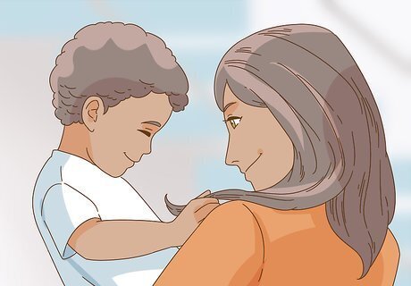 Establish a feature that signals to the child who you are. Identify yourself to the child by directing their attention to an aspect of yours that is consistent. For instance, if you have long hair you might brush your child's hand with it, or if you always wear a ring you can let the child feel for your ring. There can be a sign that you make to tell the child it's you, but it's also helpful to direct the child's attention to an identifying feature that they can find on their own, in case you forget to give them your name-sign.