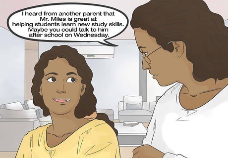 Urge the teen to ask for help with study skills. Studying efficiently and being adequately prepared for a test are key to doing your best. Encourage them to ask teachers or a school counselor for help with learning more efficient ways to study for tests. Try saying to your teen, "I heard from another parent that Mr. Miles is great at helping students learn new study skills. Maybe you could talk to him after school on Wednesday." You can suggest your teen approach a teacher and say, "Mr. Miles, I heard you sometimes help students with study skills. I'm having trouble studying for the upcoming history exam. Could you help me after school one day this week?"