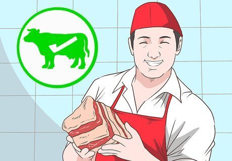 Buy ethical meat and animal products. There are many organizations dedicated to making the lives of animals in the meat and food industry as humane as possible. Try browsing local supermarkets, butchers, and retailers through databases to see if their products are certified humane. Keep in mind that combating animal abuse does not necessarily mean abstaining altogether. Most organizations have objective standards set for their certifications, which can be found on their websites, but occasionally those standards vary. Be sure to check with ethical and humane organizations in order to decide if their standards meet yours. Ask your butcher at your local grocery store if they stock any animal products or meat that is certified humane. Shop around for plant-based alternatives to meat products. Impossible Foods, Beyond Meat, and Gardein are three big brands that offer meat alternatives, both in grocery stores, restaurants, and even fast food chains, like Burger King.