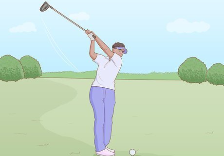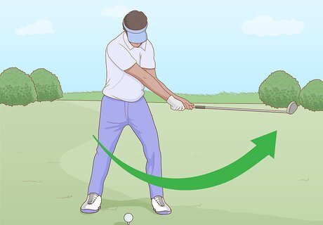 Hit the ball on the descent of your swing. Hit the ball just as you would with a long iron. If you’re hitting down on the ball correctly, your club should leave a divot, or a mark in the grass, just in front of the ball’s position after making contact. Even though the hybrid clubhead looks like the clubhead of a fairway wood, you don’t want to sweep the ball like you would when hitting with a wood. Finish your swing with your weight on your left leg.