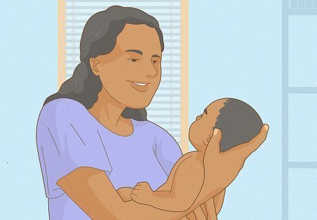 Do a face-to-face hold to interact with your baby. Place one hand under the baby’s head and neck to support them, moving the other under their bottom. Then, hold the baby out in front of you, just below your chest. Keep the baby’s head and body tilted up, so the two of you can easily look at one another’s faces—and have fun smiling at your adorable baby! If you want to interact with a baby (talking to them and making silly faces, for instance), the face-to-face hold is a great way to do that.