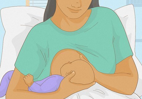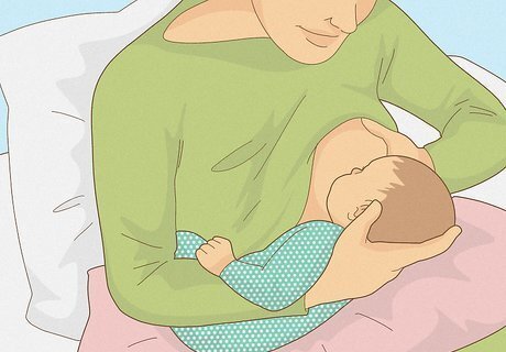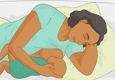 Try a side-lying position for late-night feedings. Lie on your side somewhere comfortable (like a bed) and place the baby beside you, lifting your breast so the baby can easily latch onto it. It’s as simple as that! However, it’s best to avoid lying down in this position if you’re sleepy since it’s unsafe to fall asleep next to a newborn baby. Additionally, it’s a good idea to hold the baby upright after feeding for about 30 minutes, if possible. When your baby is upright, gravity can help them digest their meal. When they’re lying flat, they’re more likely to spit up.