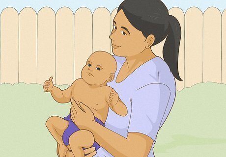 Let curious babies see their surroundings with the “hello world” hold. First, let your baby’s back rest against your chest so their head is supported. Place one arm under their bottom and the other across their chest. Then, make sure the baby’s head is still supported, with the baby facing away from you so they can look around and see what’s going on. If you’re sitting down, you can place the baby in your lap instead, which means you don’t need to put a hand under their bottom.